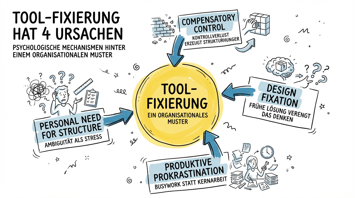 Das macht Tool-Fokus zu einem psychologischen Beruhigungsmittel. Es wirkt kurzfristig — löst aber nicht zwingend das eigentliche Problem.