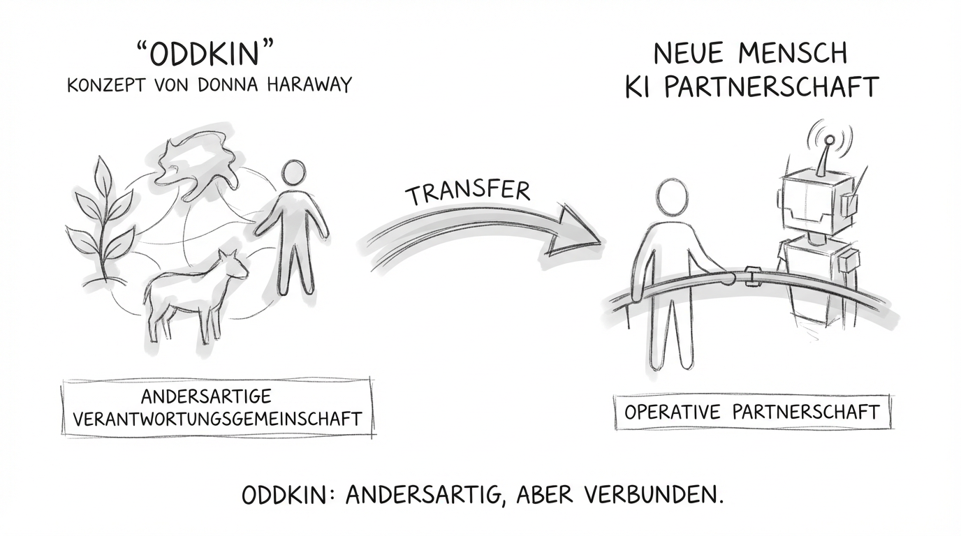 Das Konzept 'Oddkin' von Donna Haraway bietet einen Rahmen für Human-AI-Collaboration als Verantwortungsgemeinschaft jenseits von Werkzeug und Mensch-Vermenschlichung.